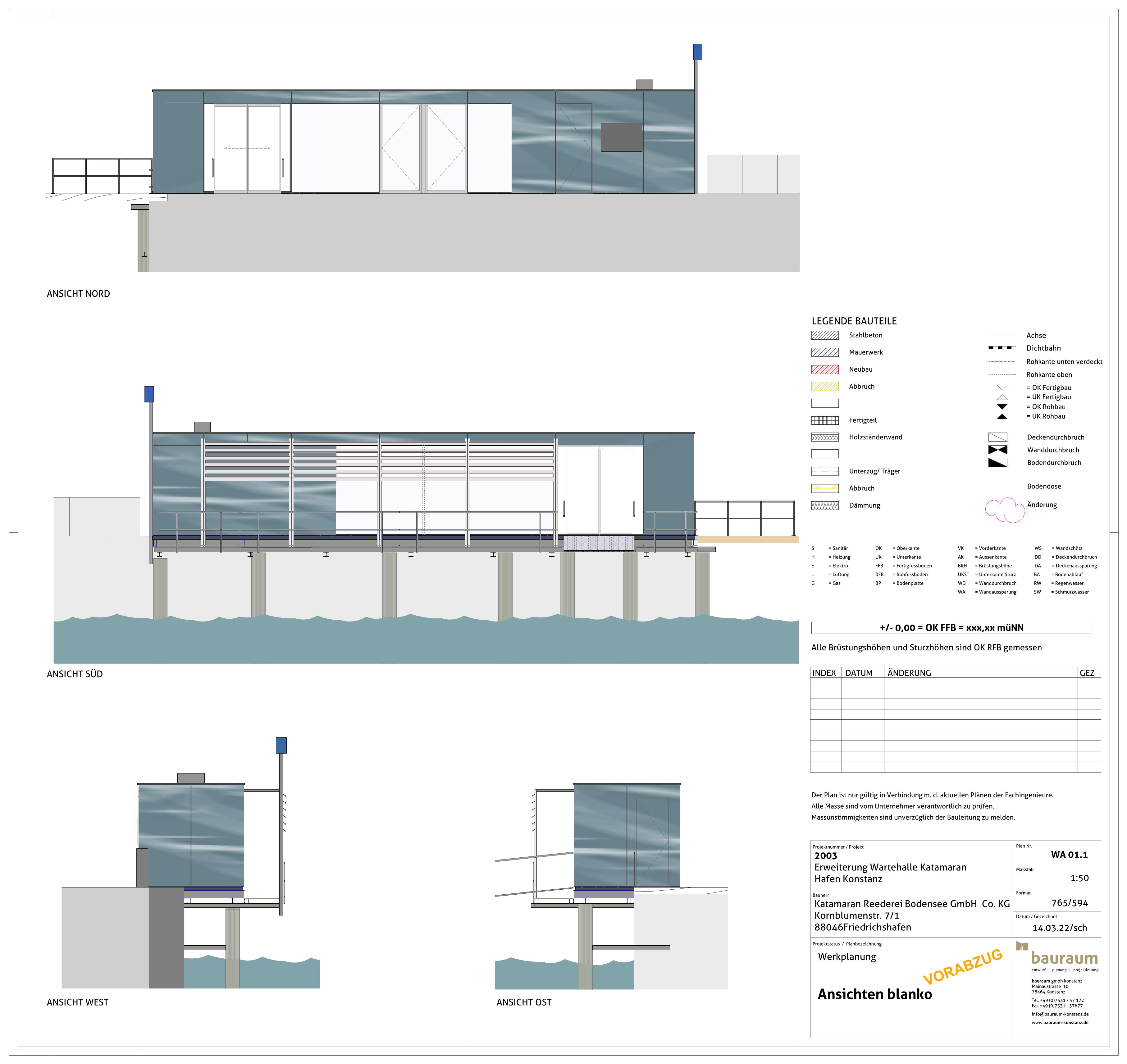 Federführend für Entwurf und Umbau ist das Architekturbüro bauraum aus Konstanz. Architekt Gerhard P. Maier verband beim Entwurf die bisher bewährte, reduzierte Kubusform mit einer hochwertigen Glasfassade. Passend zur Umgebung umspielen Wellen in Blautönen das Gebäude. Diese künstlerische und doch zurückhaltende Gestaltung war wichtig, steht doch die Wartehalle prominent im Konstanzer Hafen in direkter Nachbarschaft zu Imperia und Konzil.